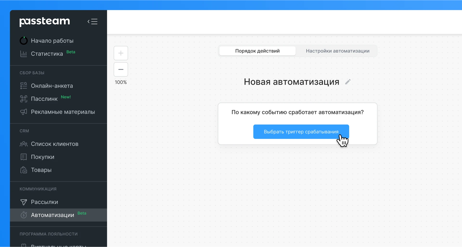 Для начала, зайдите в свой аккаунт на платформе Passteam. Перейдите к разделу "Автоматизации". Вы найдете этот раздел в левом меню на главной панели инструмента.