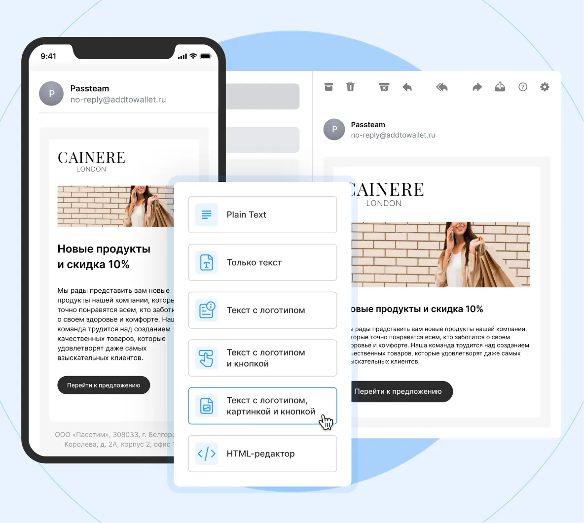 Создавайте потрясающие email-рассылки в удобном конструкторе. Экспериментируйте с цветами, шрифтами и изображениями длясоздания уникальных писем, оптимизированных для всех устройств и совместимых с популярными почтовыми сервисами. Просто и быстро!
