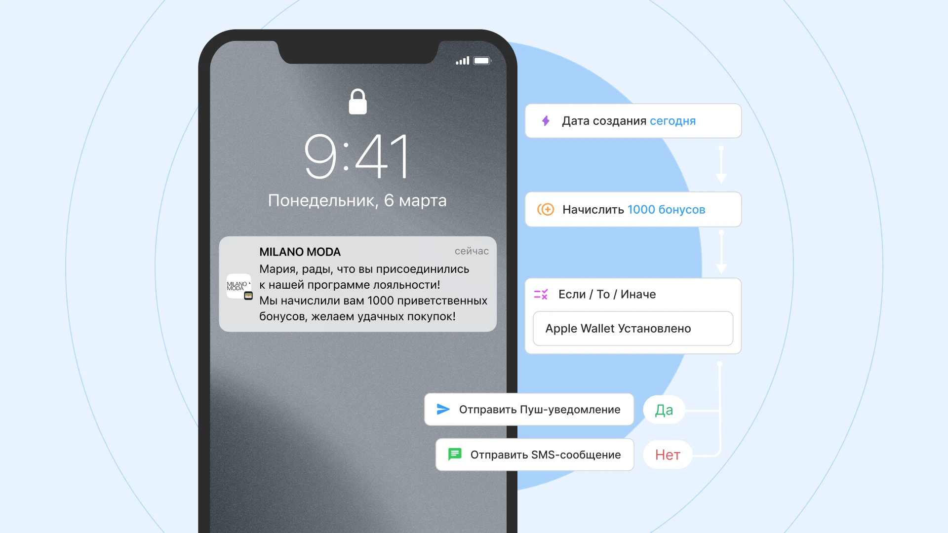 Чтобы познакомить клиентов с брендом, рассказать о преимуществах, коллекциях. В данной цепочке срабатывает автоматизация: клиентам начисляется 1000 бонусов на их карту лояльности в Apple Wallet или Google Pay.